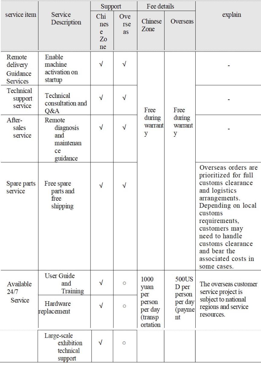 Due to geographical restrictions, overseas areas do not provide door-to-door repair services, and only remote technical support and spare parts replacement are available for troubleshooting.